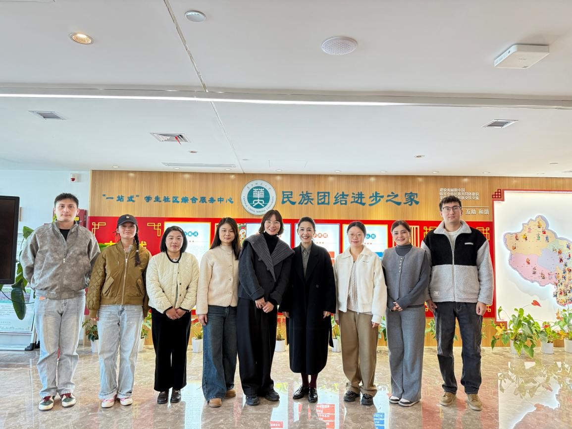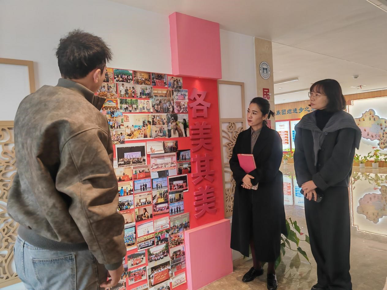 华中师范大学民族团结教育办公室主任、美美与共工作室主持人美合日姑丽一行热情接待我校一行。在美合日姑丽一行的引导与讲解下,我校人员参观了华大民族团结进步之家的功能区域、文化展示墙以及相关设施,详细了解在空间布局、文化氛围营造以及活动开展等方面的创新理念与具体实践。