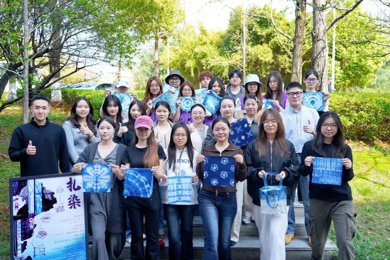 实操环节中,同学们以素白方巾为载体,运用折叠、捆扎等传统技法,结合创意打造专属造型,随后在志愿者协助下完成浸染、漂洗和解结。当捆扎线条解开,星空渐变、天然石纹等独一无二的纹样呈现,每一件作品都是匠心与自然的碰撞,同学们手持成品合影留念,收获满满成就感,真切体会到非遗技艺的独特魅力。